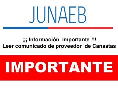 A todos los apoderados que recibieron canastas de Junaeb el jueves 15 y viernes 16 de este mes, les informamos que con fecha 16 de abril 20:00 horas recepcionamos el comunicado que hace referencia a un producto defectuoso de las canastas entregadas por la empresa Las dalias, solicitamos leer comunicado..