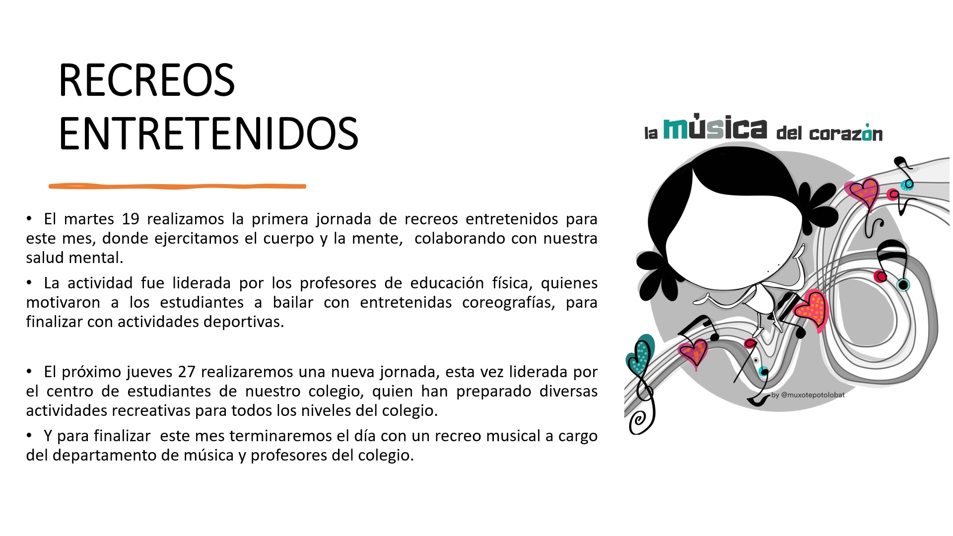 En Comunidad celebramos este mes con actividades de formación, reflexión y análisis en la Pausa Diaria y la asignatura de Orientación, con actividades de zumba y baile entretenido en los recreos, coordinadas por el Equipo de Convivencia Escolar,  el Profesor Jorge Castillo y el Centro de Estudiantes, con Charla para Padres, con actividades musicales lideradas por el Departamento de Música y un Cuentacuentos para los más pequeños liderado por nuestro Equipo CRA.
