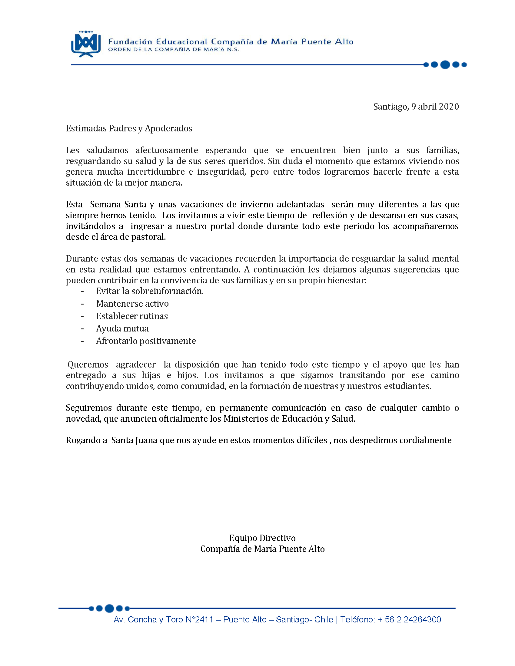 En esta oportunidad realizamos una mirada amplia a la Comunidad a la que se están integrando, identificando elementos centrales del Proyecto Educativo de la Compañía de María, a través, del Modelo Pedagógico SIGNA y el Modelo de Evangelización UNITAS y realizando un primer acercamiento a la vida de nuestra fundadora Santa Juana de Lestonnac.