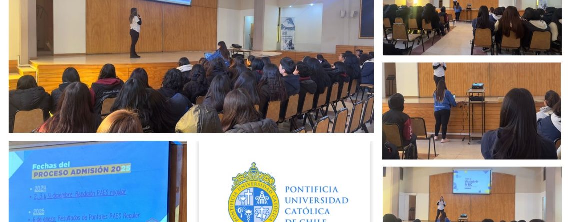 La Pontificia Universidad Católica, para complementar el proceso de acceso a la educación superior con nuestros estudiantes de IV Medio, presentó el miércoles 24 de julio, información relevante sobre el proceso de postulación a esta casa de estudios, sus beneficios, sus carreras. Los relatores fueron un equipo de estudiantes de las carreras de Trabajo Social y de Estadística.