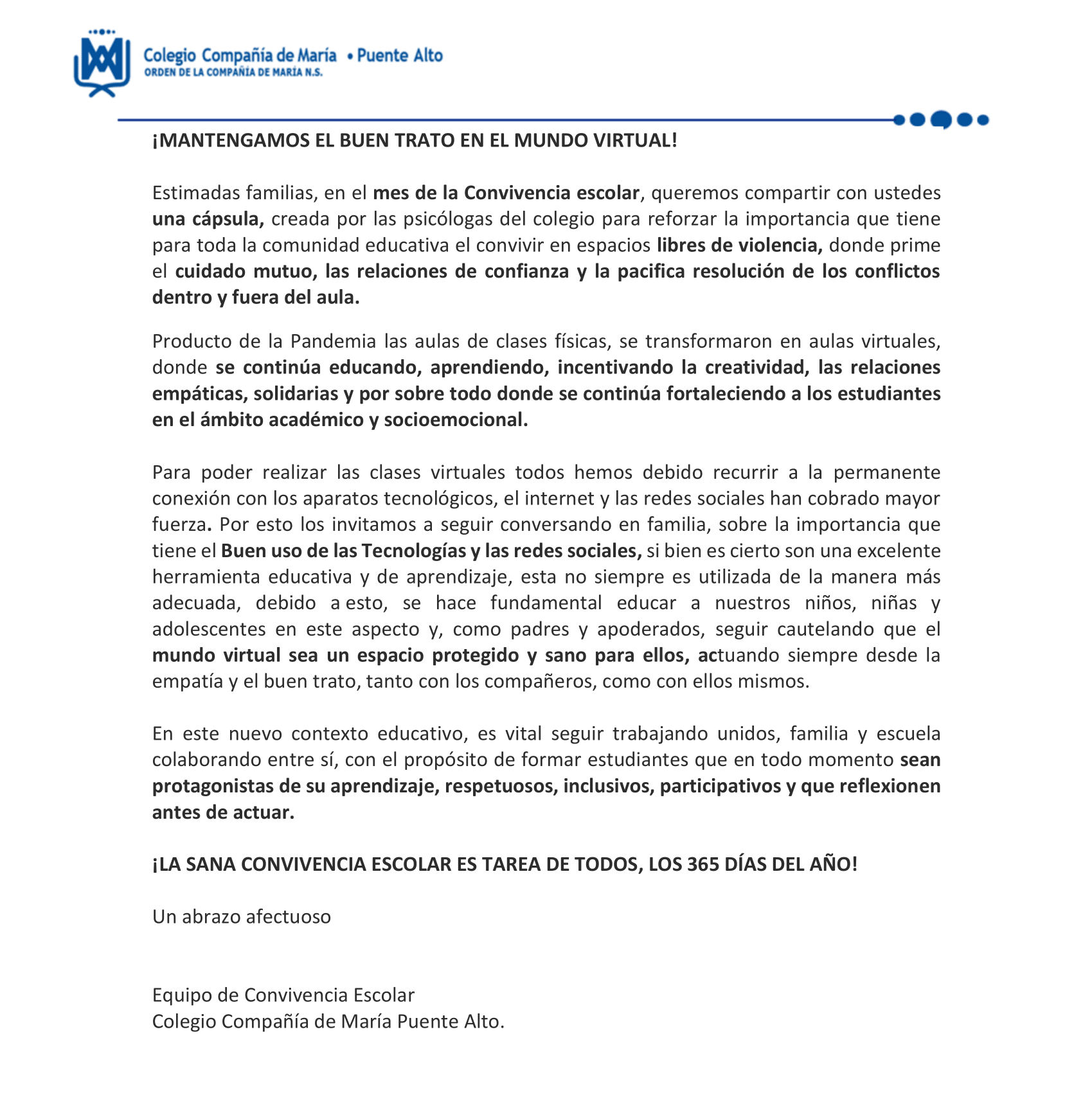 Día de la Convivencia Escolar Admin ciamaria2021-04-28T14:13:47+00:00 Link a noticia descargable: Noticia mes de la Convivencia Escolar Capsula convivencia escolar: https://www.ciamariapuentealto.cl/sitio/wp-content/uploads/2021/04/Capsula-convivencia-escolar.mp4 Facebook Twitter LinkedIn Google + Email 28 abril, 2021Aula Virtual Read more...
